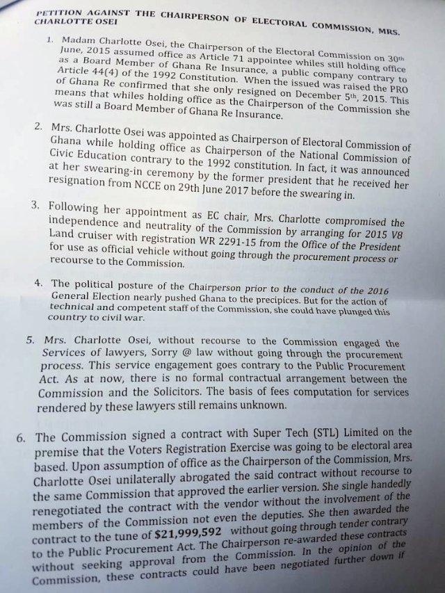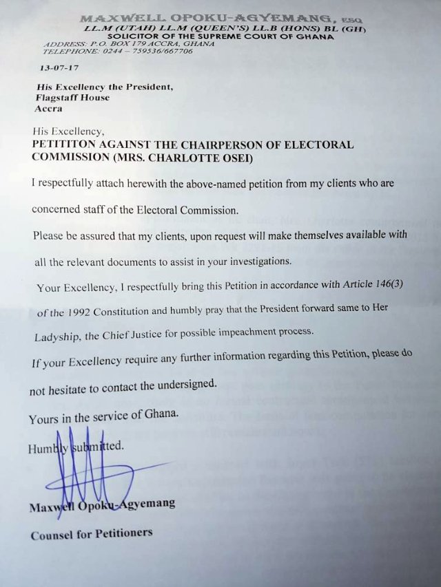 They are therefore asking the President to forward their petition to the Chief Justice to subsequently begin the process to impeach the EC chair.