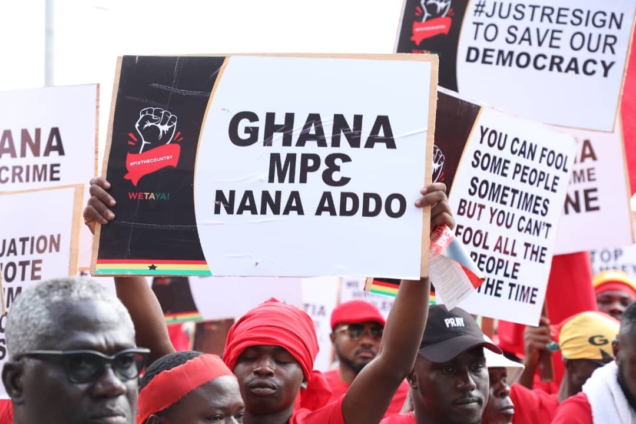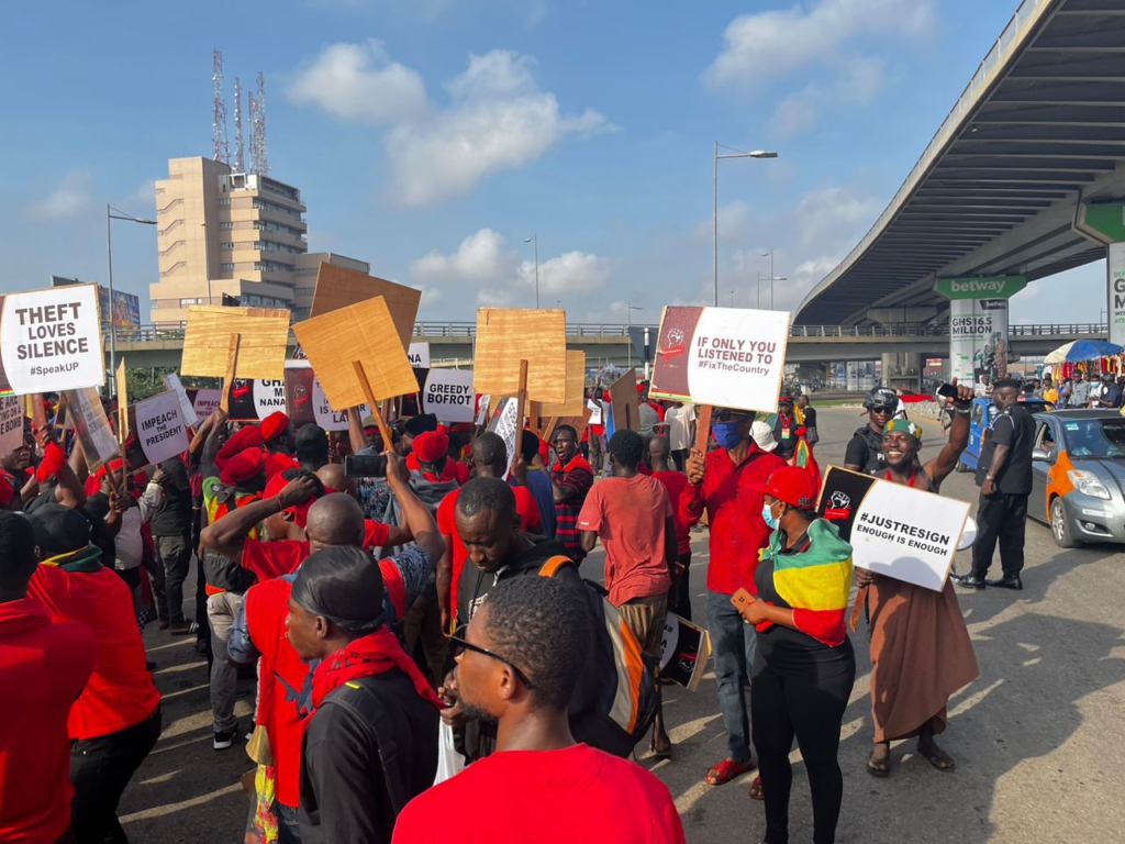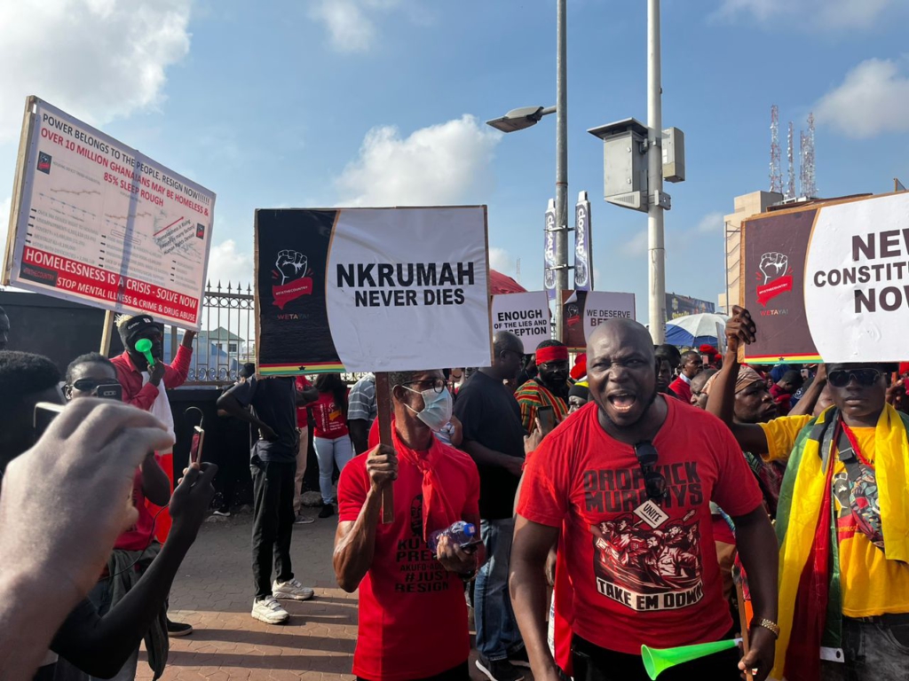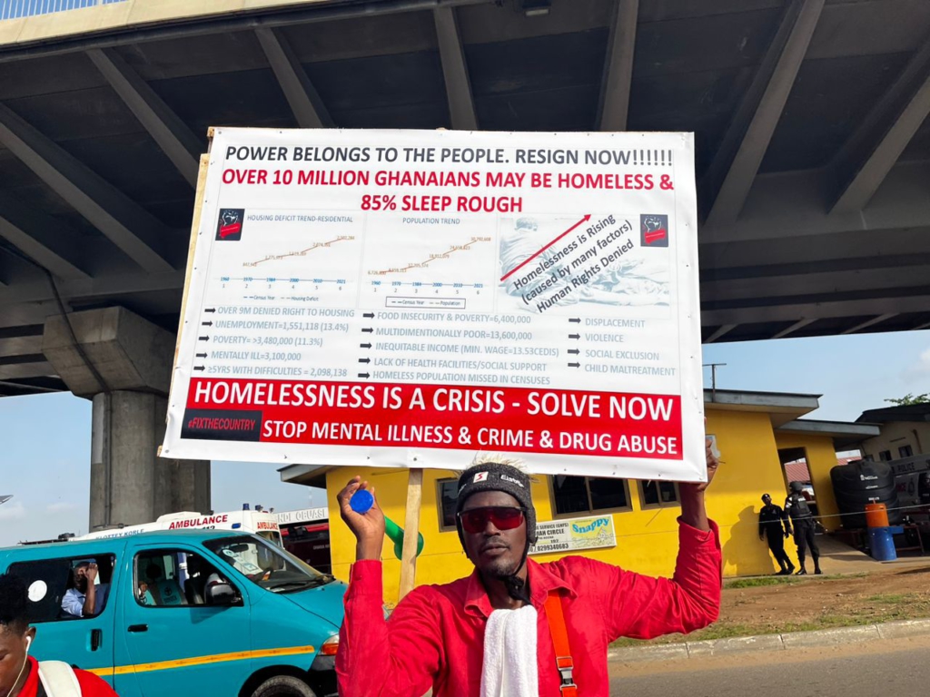 Written on placards the protestors held in their hands are inscriptions line “Power belongs to the people. Resign Now!!! Over 10 million Ghanaians may be homeless & 85% sleep rough”; “Mr. President, You are wearing a pair of oversized shoes. Step down.”; “Nana, Ghanaians are tired of your government”; “New Constitution Now”, among others.