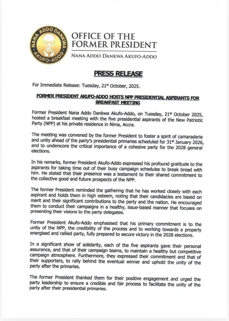 According to a statement released by the Office of the Former President, the gathering was held to encourage a spirit of camaraderie among the aspirants and to underscore the importance of party cohesion as the NPP looks ahead to the 2028 general elections.