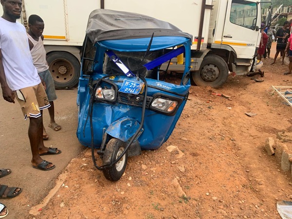 Some eyewitnesses,in an interview with OTEC News said the pragia tricycle had reached its destination and was attempting to alight the passenger when the cargo car lost control and ran over it.