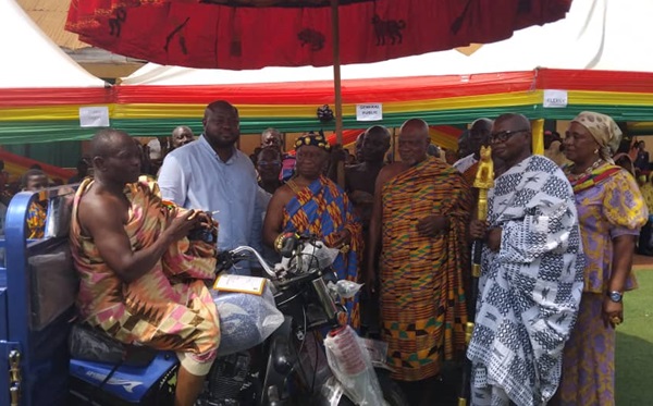 Mr John Yeboah, Asokwa Best Farmer on his tricycle with the MCE and Kaase Chief standing beside him during the farmer’s day celebration in Asokwa