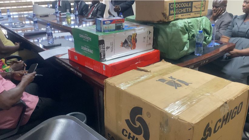 The items presented on Tuesday, December 2, 2025 included 10 boxes of cutlasses, 17 boxes of Wellington boots, 16 knapsack spraying machines, 7 tabletop gas burners, an oven, 16 radio sets, and other farming-related tools and equipment.