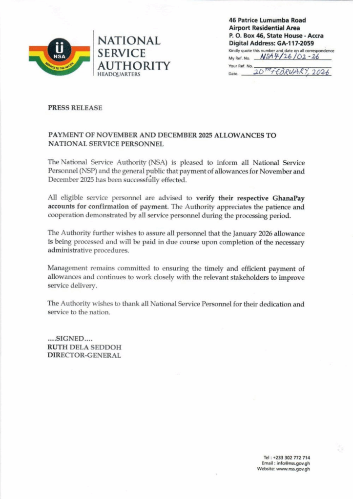 The National Service Authority (NSA) has announced that allowances for November and December 2025 have been successfully disbursed to all eligible National Service Personnel (NSP).