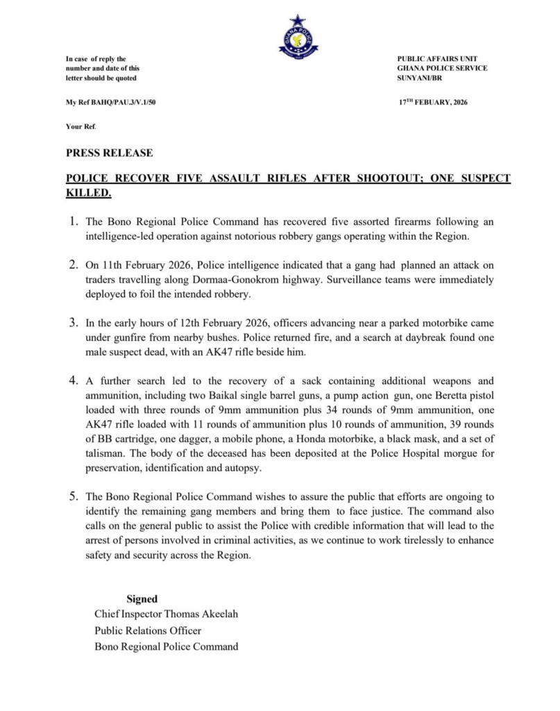 The statement, signed by Chief Inspector Thomas Akeelah, Public Relations Officer of the Bono Regional Police Command, reiterated the Police Service’s commitment to improving safety and security in the area.