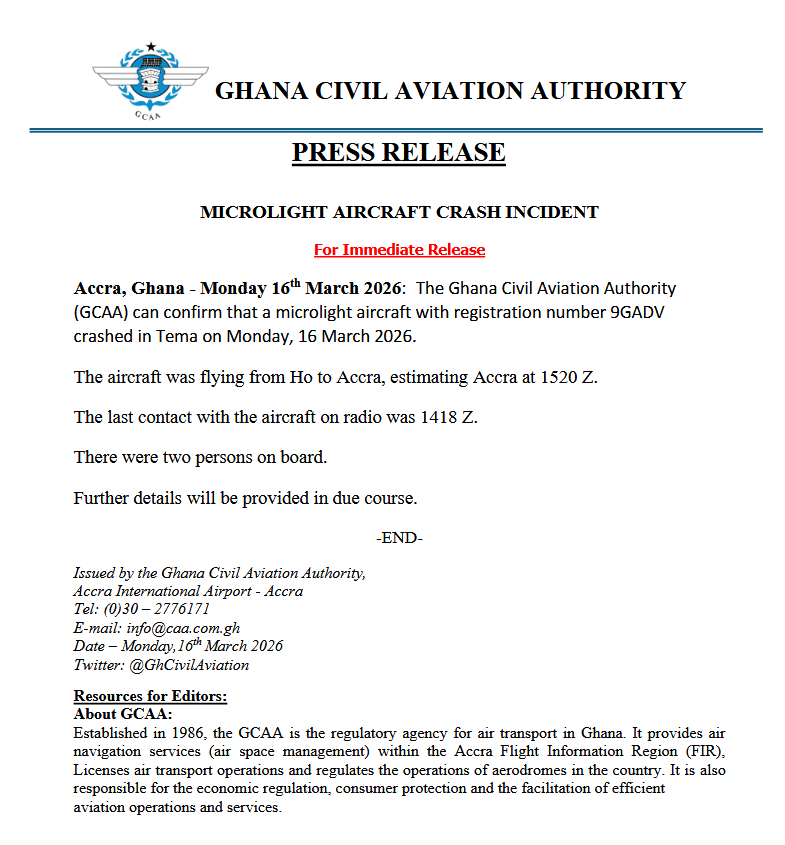 The Ghana Civil Aviation Authority (GCAA) confirmed that the microlight aircraft, registered as 9G-ADV, crashed on Monday, 16 March 2026, with two persons on board.