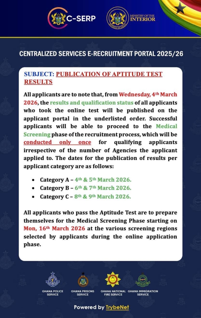 In a notice, the Ministry stated that beginning Wednesday, March 4, 2026, results and qualification status for all applicants who sat the online aptitude test will be published on the applicant portal.