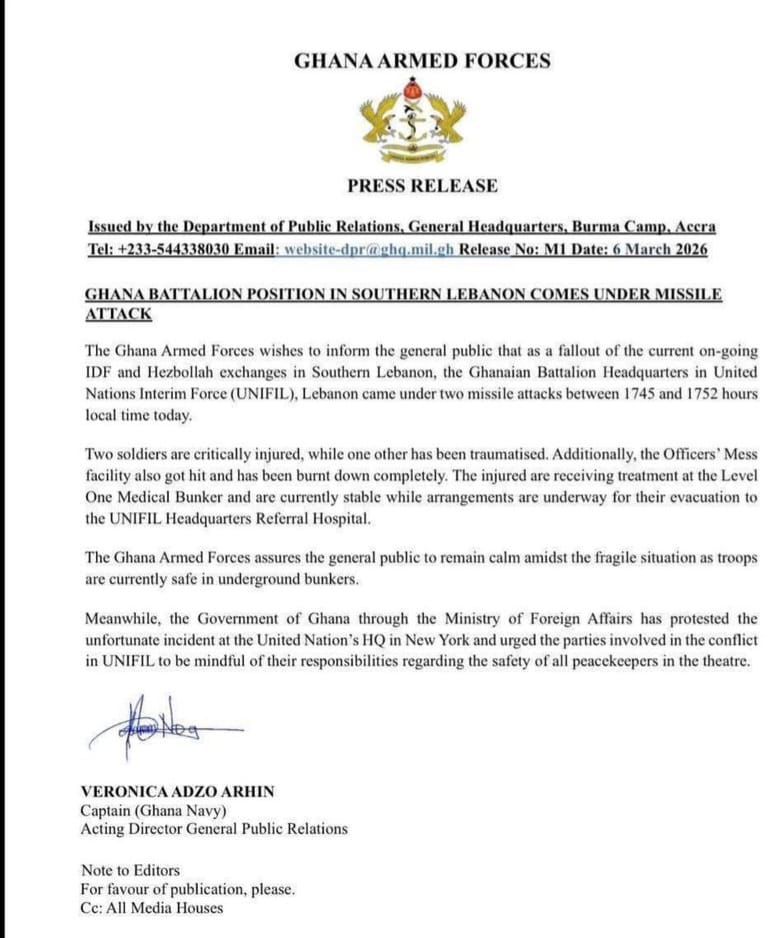 Meanwhile, the Government of Ghana, through the Ministry of Foreign Affairs, has lodged a formal protest at the United Nations headquarters in New York, urging all parties in the UNIFIL operational area to uphold their obligations to protect peacekeepers.