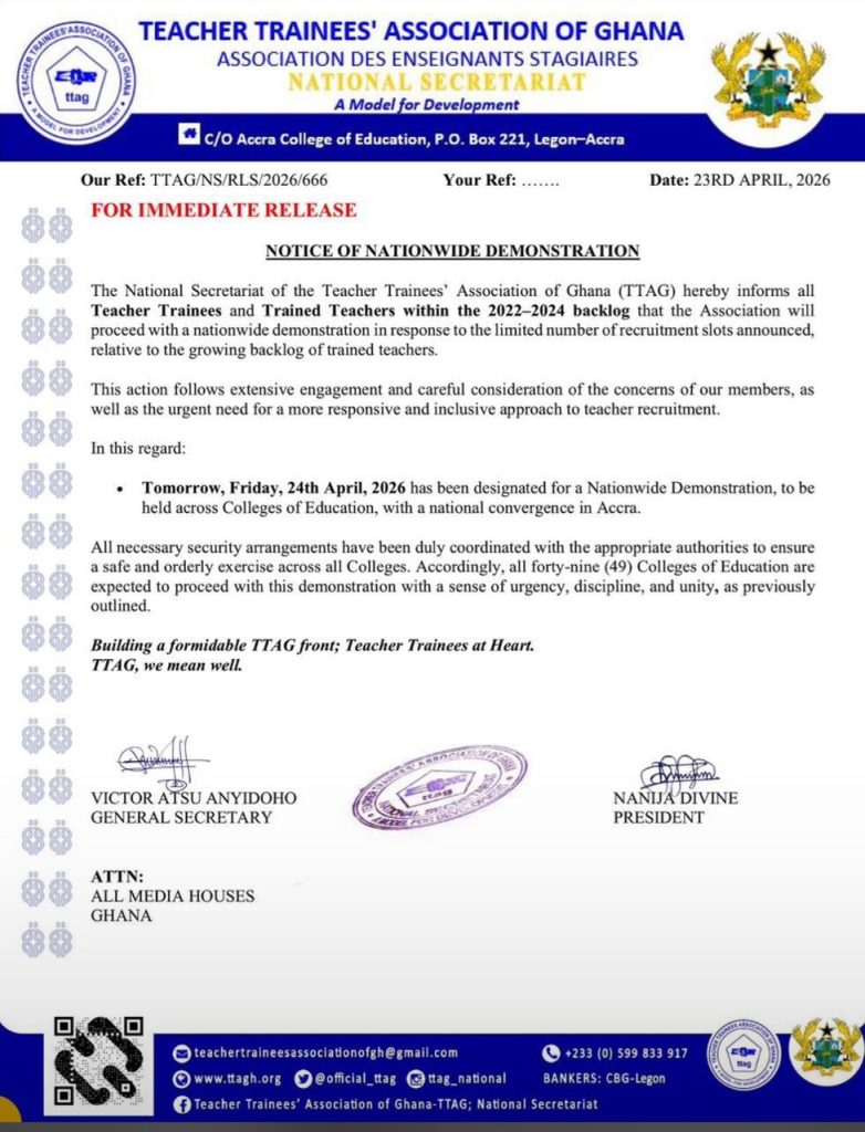 “This action follows extensive engagement and careful consideration of the concerns of our members, as well as the urgent need for a more responsive and inclusive approach to teacher recruitment. In this regard: Tomorrow, Friday, 24th April, 2026, has been designated for a nationwide demonstration to be held across Colleges of Education, with a national convergence in Accra.