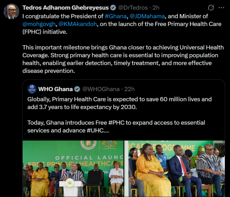 The World Health Organisation (WHO) has commended President John Dramani Mahama for the rollout of the Free Primary Health Care initiative, describing it as a significant step toward strengthening healthcare delivery and advancing Universal Health Coverage.
