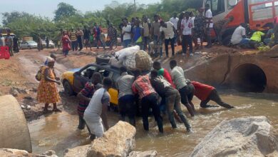 Photos: Mampong-Ejura Highway cut off as floods collapse bridge; hundreds of commuters stranded