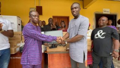 Hon Akwasi Konadu (right), Member of Parliament for Manhyia North presenting the IT items to the Headmaster of the Duase…