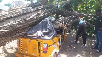 Video: Huge tree collapses on motor tricycle at Kumasi Racecourse Market, one critically injured