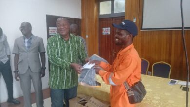 Hon Samuel Pyne presenting some Wellington Boots and an undisclosed amount of cash to the BuzStopBoyz during the meeting Kumasi…