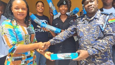 Miss Harriet Aryeh-Lanyo, Aspiring NPP MP for South Dayi presenting the led flashlights to the District Police Commander durind a…